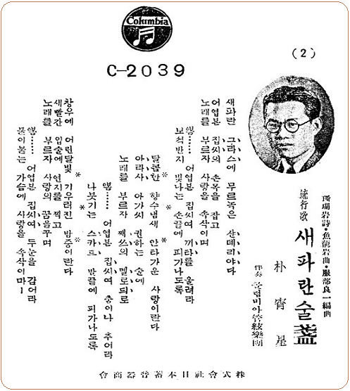 ![]() "새파란 술잔" (1940) 珊瑚岩 작시/ 魚龍岩 작곡/ 服部良一 편곡/ 노래 朴宵星 (1940년 5월 콜럼비아레코드 발매)